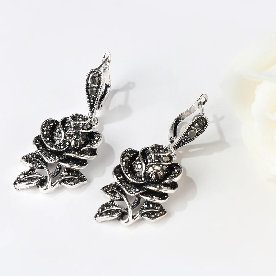 Finest Kinel Fashion Silver Vintage Wedding Jewellery Set Black Crystal Rose Flower Ring Jewelry Sets For