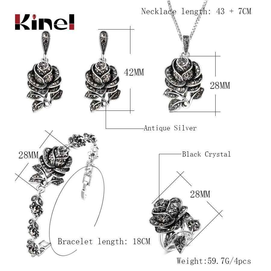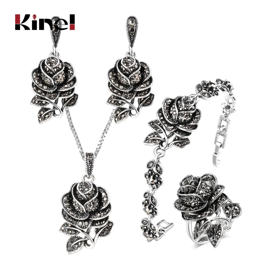 awesome Kinel Fashion Silver Vintage Wedding Jewellery Set Black Crystal Rose Flower Ring Jewelry Sets For