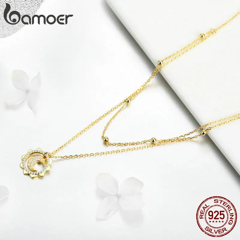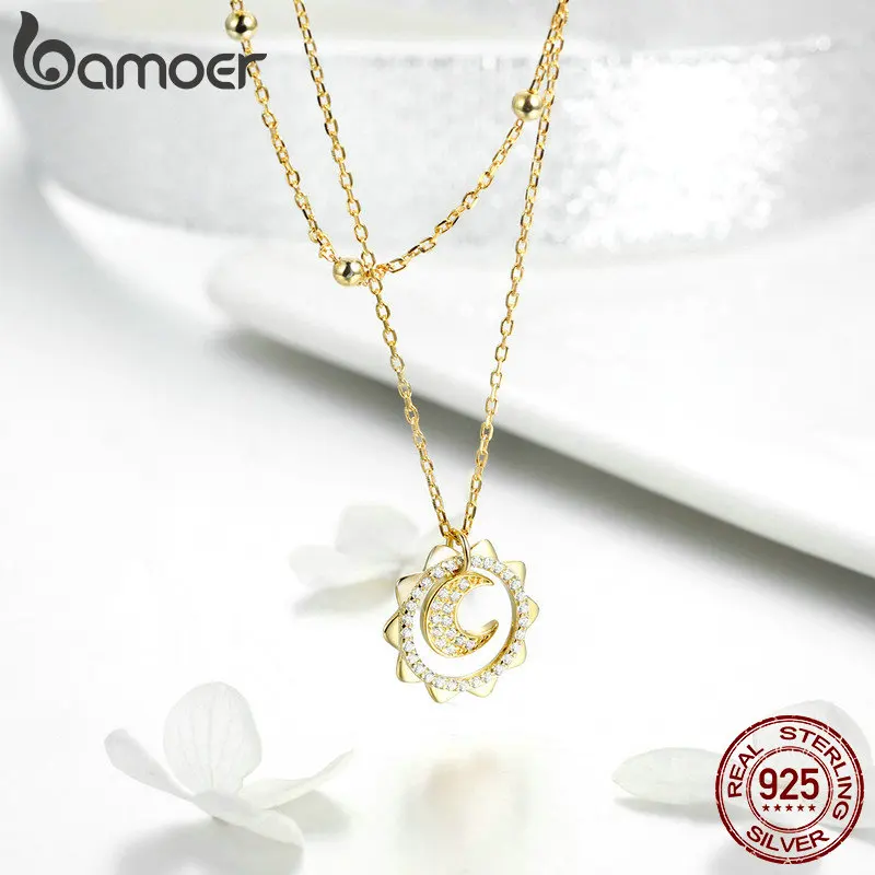 discounted BAMOER Vintage 925 Sterling Silver Sun Moon Shape Double Layers Choker Necklaces Pendant for Women